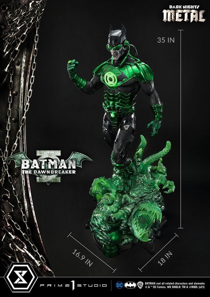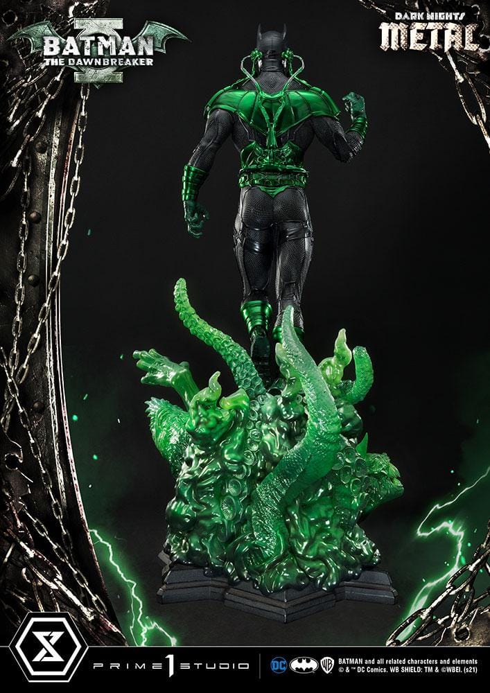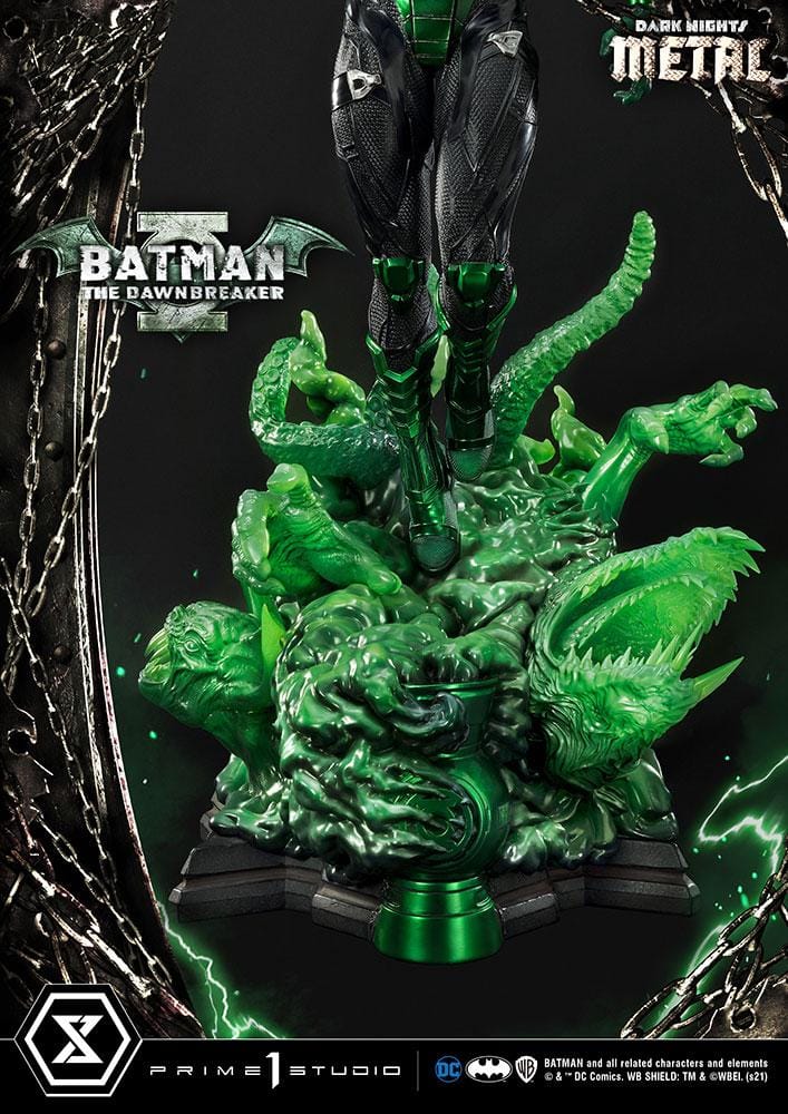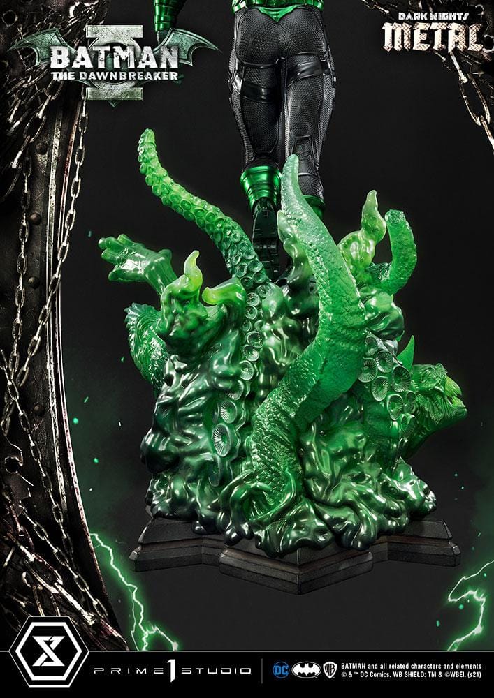 Prime 1 Studio’nun The Dawnbreaker heykeli, 35 inç yüksekliğinde, karanlık adaletini dağıtmaya hazır bir şekilde karşımızda! Heykel, Jason Fabok’un etkileyici Batman: The Dawnbreaker #1 kapağına bir gönderme niteliğinde; Earth-32’nin Bruce Wayne’inin altından fışkıran koyu yeşil enerjiyi tasvir ediyor. The Dawnbreaker’ın boya uygulaması, etkileyici derecede canlı, metalik yeşil vurgulara sahip. Kostümünün dokusal ve titizlikle detaylandırılmış heykeltıraşlığı, korkunç görünümünü daha da güçlendiriyor. Tabanı, yalnızca Barbatos’un Kara Şövalyesi’nin yaratabileceği korkunç yapılarla canlanıyor. The Dawnbreaker’ın karanlık enerji yaratıkları, yarı saydam yeşil reçineden yapılmış olup, korkunç formları vurgulamak için hava püskürtme tekniğiyle yapılmış vurgular ve gölgeler içeriyor.